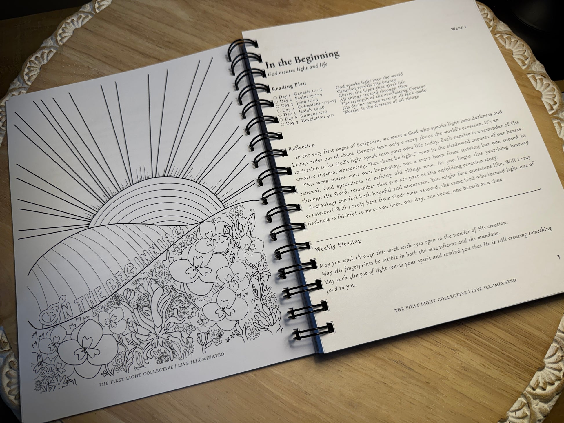 A 52-week Bible-in-a-year guided devotional and coloring journal designed to help women grow deeper in faith, restore peace, and create a meaningful daily rhythm with God. Written, illustrated, and self-published by Julie Nelson.